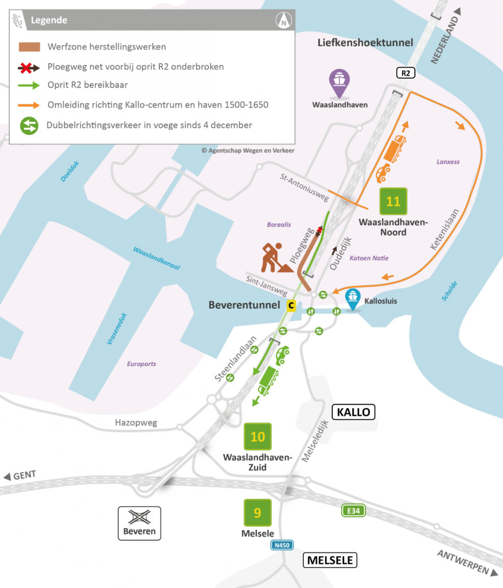 In het kader van de afbraak- en herstellingswerken aan de voormalige omleidingsroute die ingesteld werd voor de renovatie van de Beverentunnel wordt de komende twee weken gewerkt aan de Ploegweg. Vanaf maandag 5 januari is de Ploegweg tussen de oprit R2 en de rotonde Sint-Jansweg gedurende twee weken afgesloten.